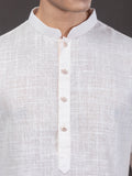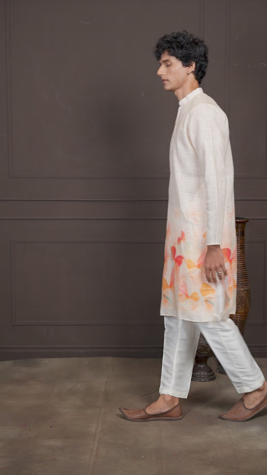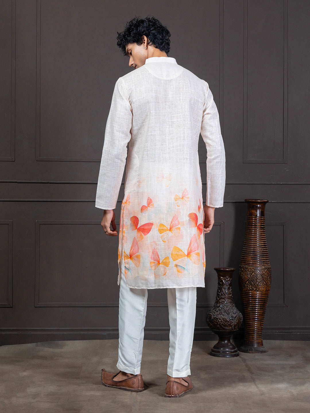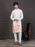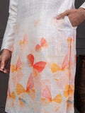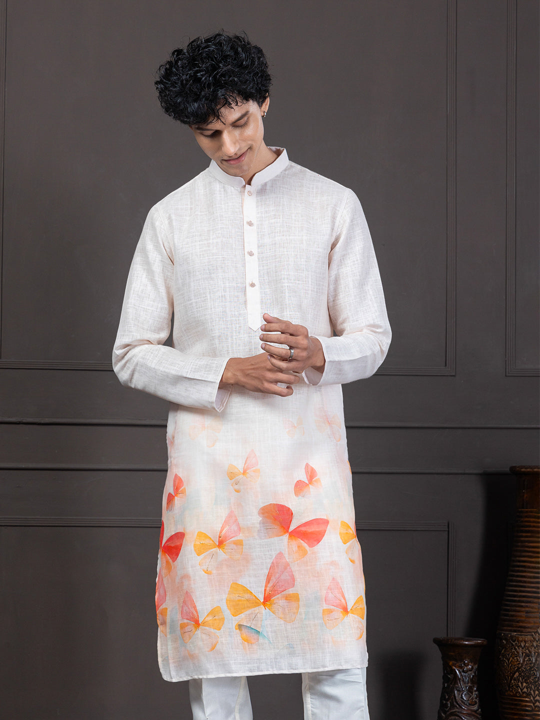 This white and orange kurta is crafted from soft blended linen, offering a lightweight and breathable feel. It features an all-over floral print, a classic mandarin collar, and long regular sleeves that keep the look polished. The straight-cut silhouette with a knee-length straight hem adds to its effortless, everyday versatility.