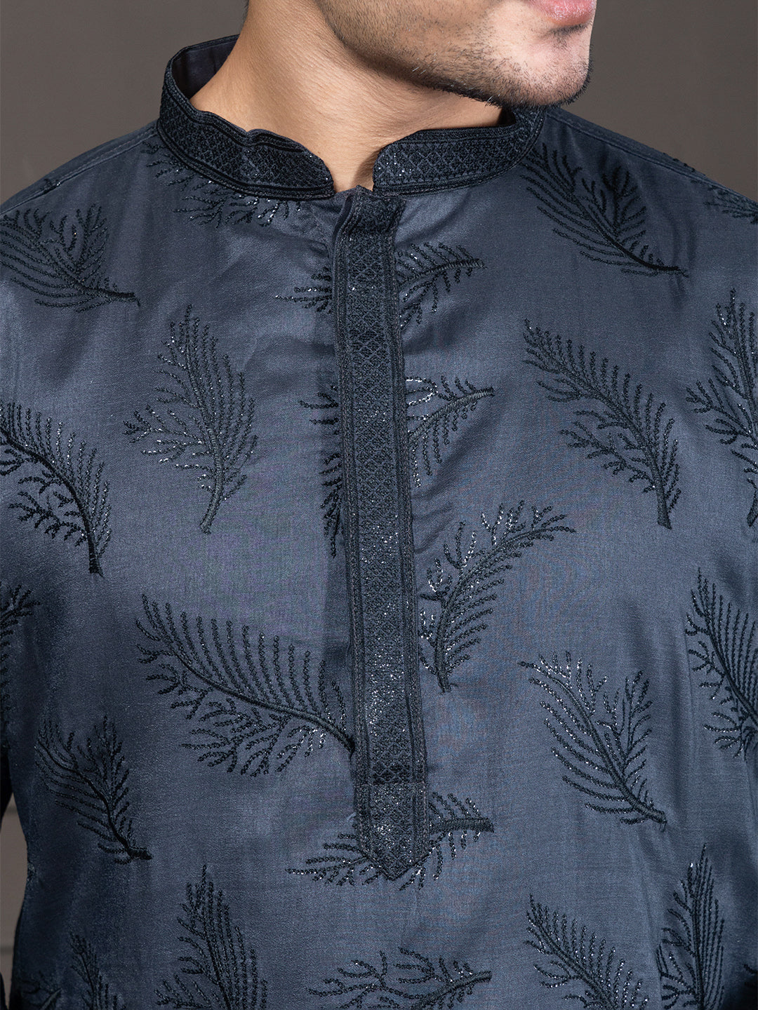 This blue kurta is crafted from soft, machine-woven Blended–silk and lined with breathable cotton for extra comfort. It features elegant leaf-pattern sequin embroidery, fine threadwork detailing, a mandarin collar, and long regular sleeves. The straight silhouette with a knee-length straight hem keeps the look clean, classic, and effortlessly refined.