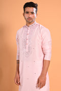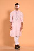A classic Blush Pink kurta crafted in soft art silk, featuring geometric embellishment with real mirror work. Designed with a mandarin collar, long sleeves, and a straight knee-length silhouette, it offers a clean, elegant, and festive look. Perfect to pair with pyjamas or tailored trousers.