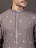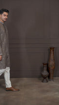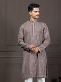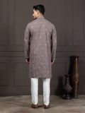 This brown kurta is crafted from blended cotton with a soft knitted cotton feel, offering comfort and a clean drape. It features delicate buti-style motif embroidery, paired with a classic mandarin collar and long regular sleeves. The straight silhouette and knee-length straight hem keep the look simple, timeless, and versatile.