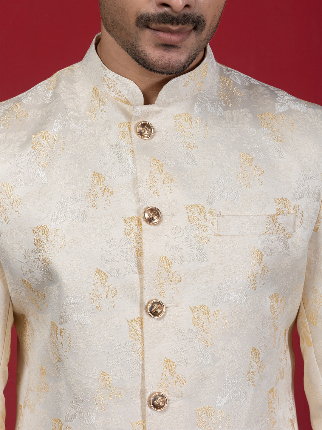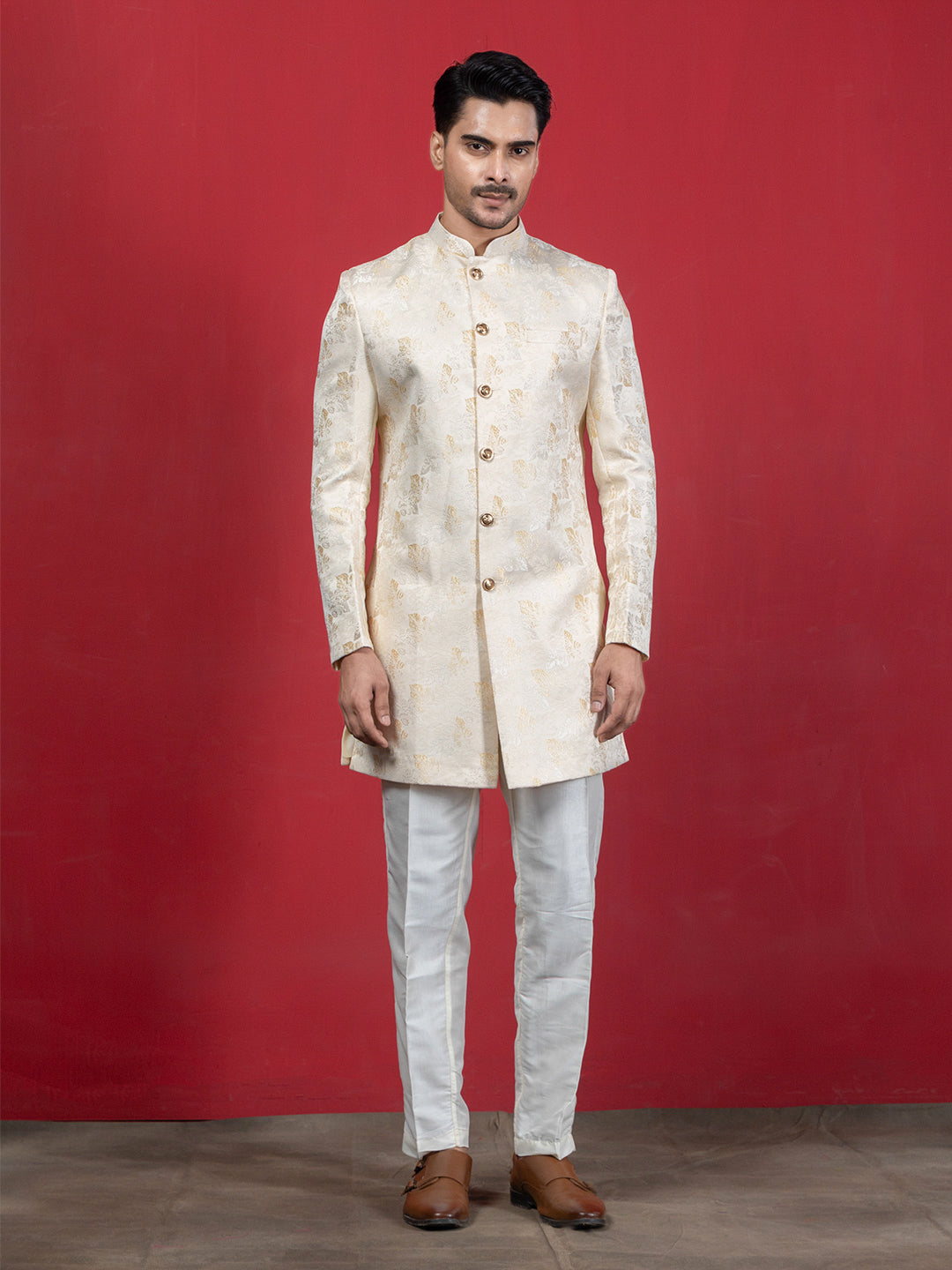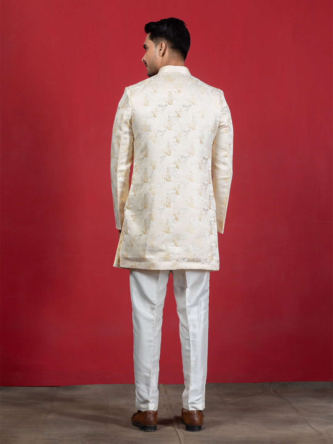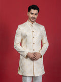 Cream Jacquard Ethnic Motif Achkan Sherwani Set