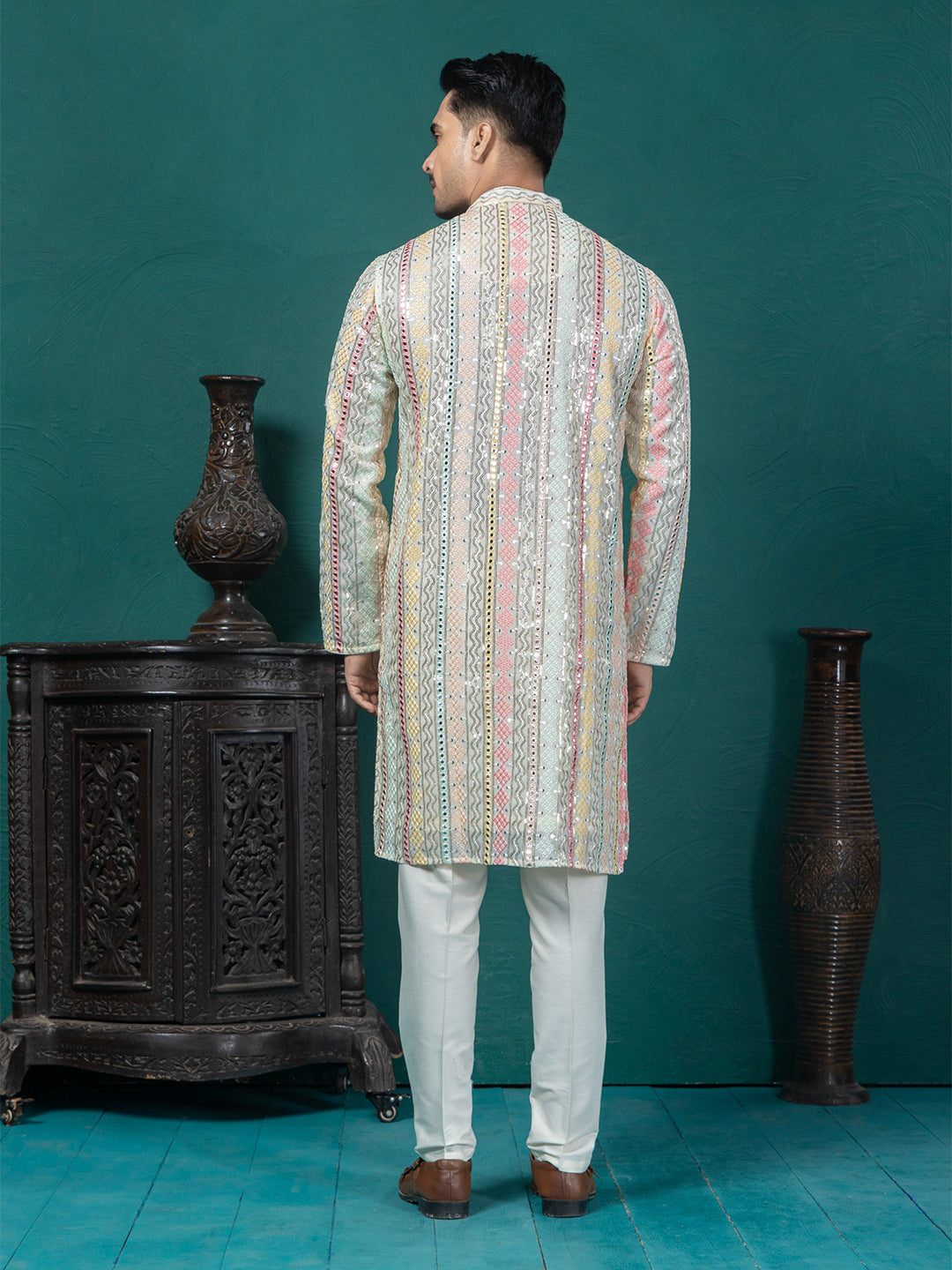 Elevate your festive wardrobe with this cream georgette kurta, adorned with geometric embroidery and multicolour threadwork, enhanced with refined mirrorwork detailing for a subtle festive shine. Designed in an elegant A-line silhouette with a mandarin collar, long sleeves, and a knee-length straight hem, it blends traditional charm with modern ease. Crafted from machine-woven georgette and finished with soft cotton lining, it’s perfect for celebrations, daytime events, and special ethnic occasions.
