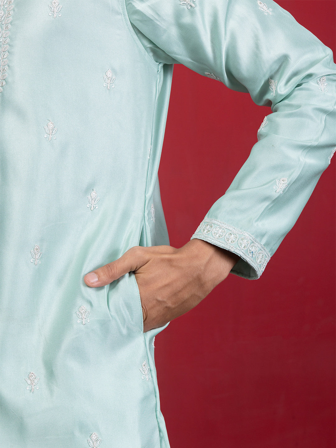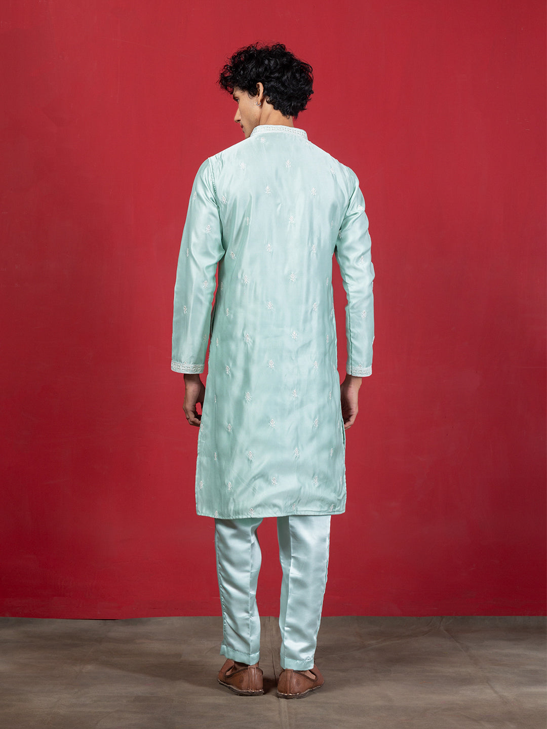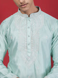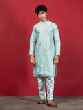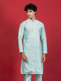 This ice blue kurta pyjama set blends understated elegance with traditional detail. The kurta features an ethnic motif yoke design, paired with a mandarin collar, long sleeves, and a straight, regular-fit silhouette that falls neatly to knee length. Crafted from machine-woven art silk, it offers a smooth, refined finish. The set is completed with a tone-on-tone pant-style pyjama featuring a semi-elasticated waistband for added comfort. Perfect for festive occasions, family functions, and cultural celebrations.