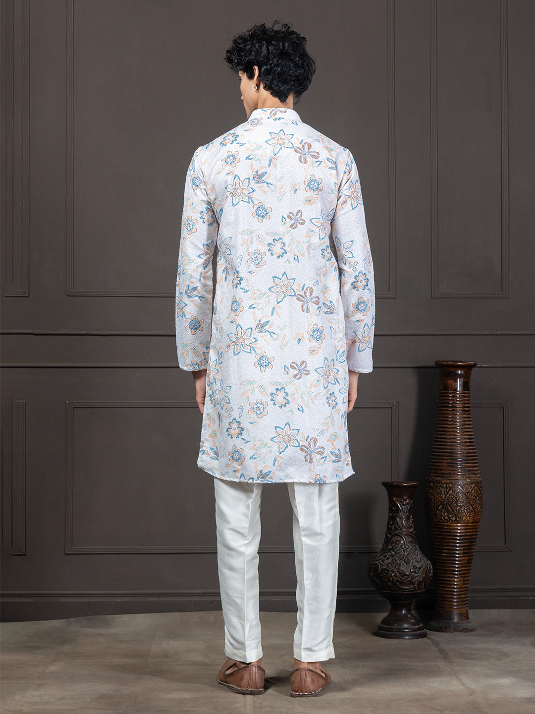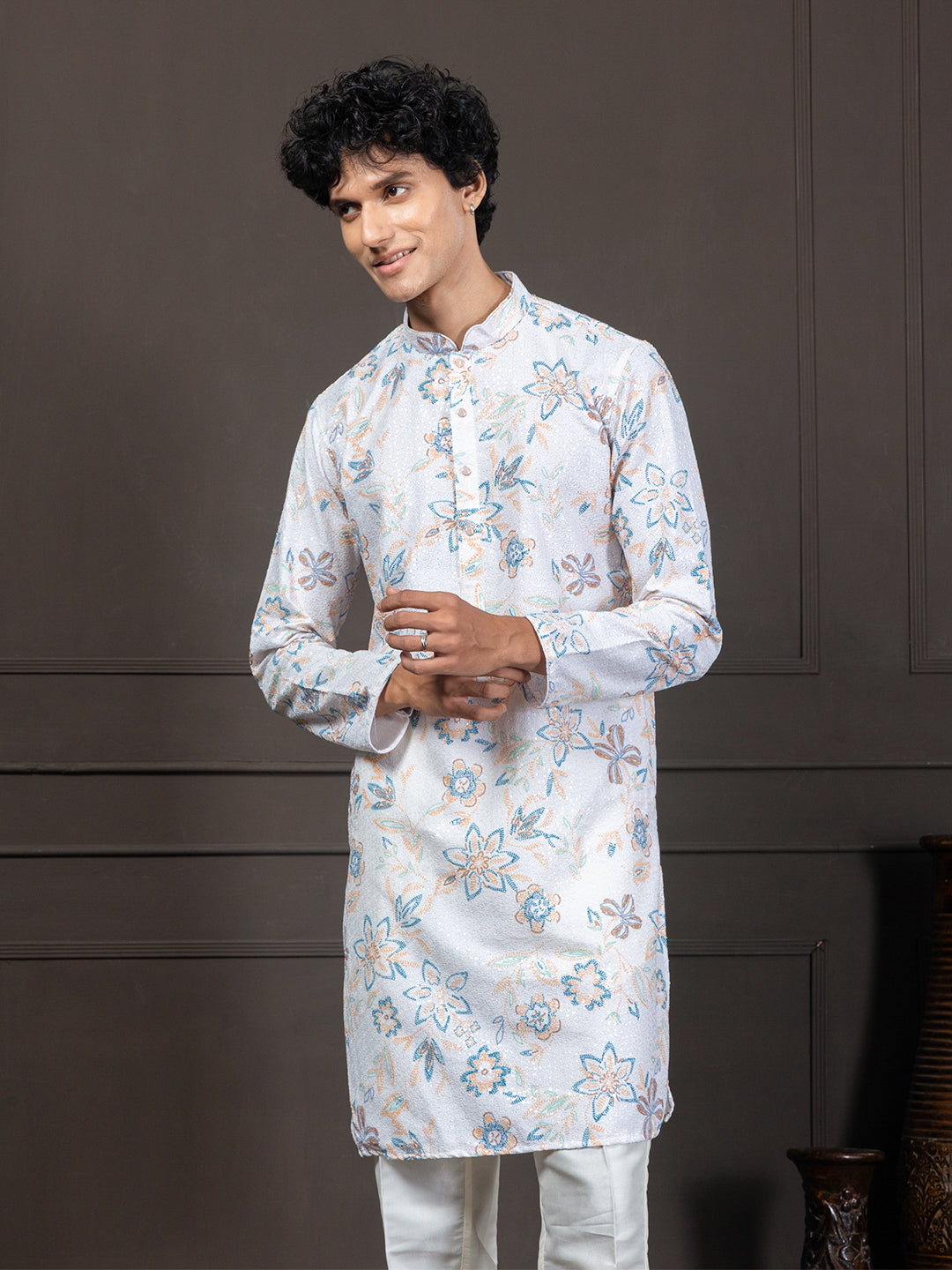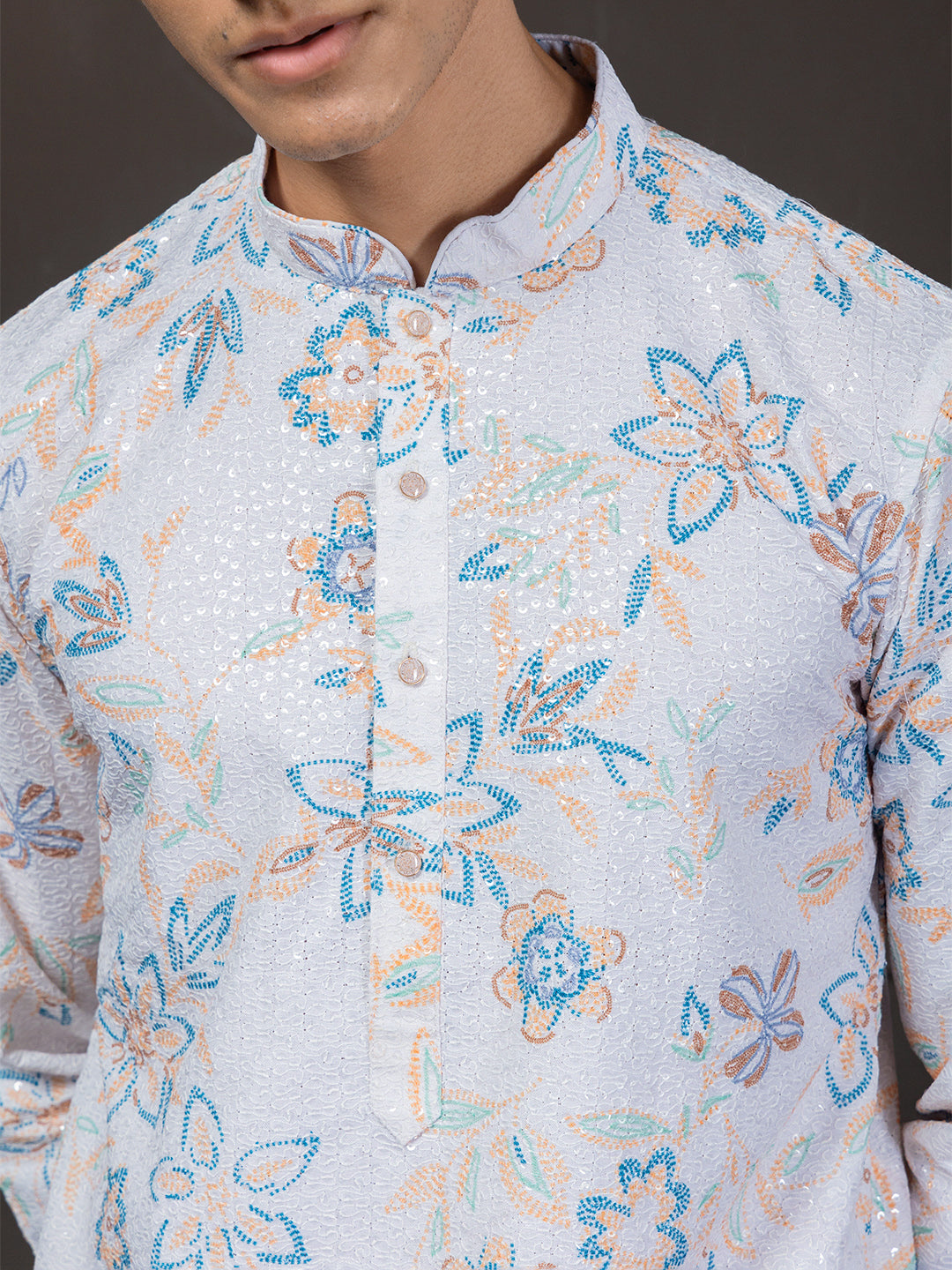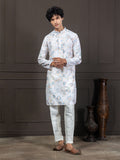 This white-and-Blue kurta blends fresh floral digital prints with all-over thread embroidery for a rich, textured look. Transparent sequin detailing adds a soft shimmer without overpowering the design. Styled with a mandarin collar, long sleeves, and a straight-fit silhouette, it falls elegantly to calf length with a clean straight hem. Crafted from machine-woven blended cotton, it offers comfort, breathability, and effortless festive charm—perfect for daytime functions, celebrations, and family gatherings.