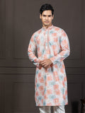 Elevate your festive style with this blended silk kurta featuring refined ethnic motif prints and handcrafted mirrorwork on the yoke. Designed in a straight, regular-fit silhouette, it comes with a mandarin collar, long sleeves, and two pockets for added functionality. The knee-length cut with a straight hem gives it a clean, elegant look—perfect for celebrations that call for subtle sophistication.