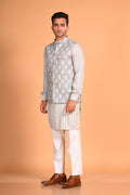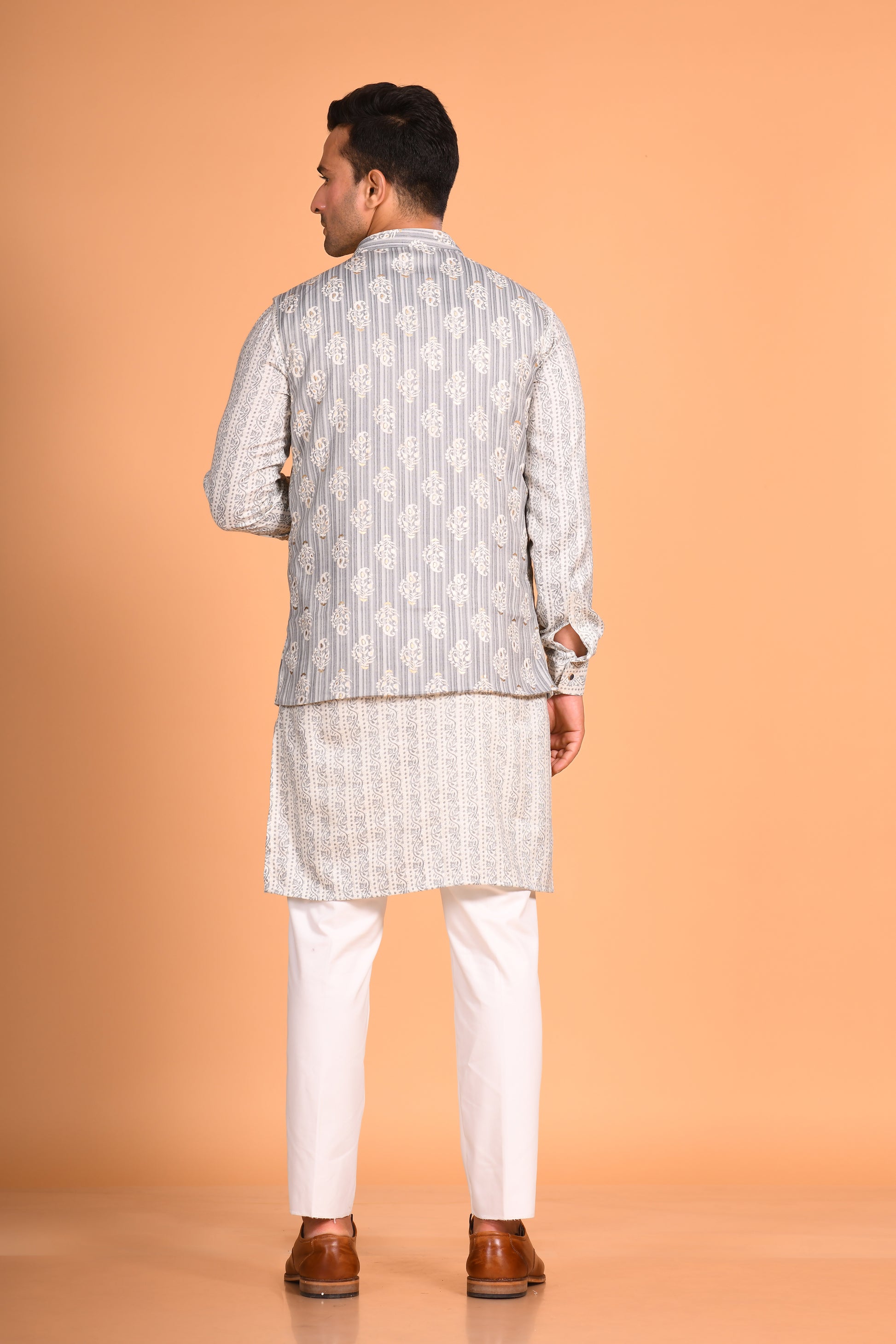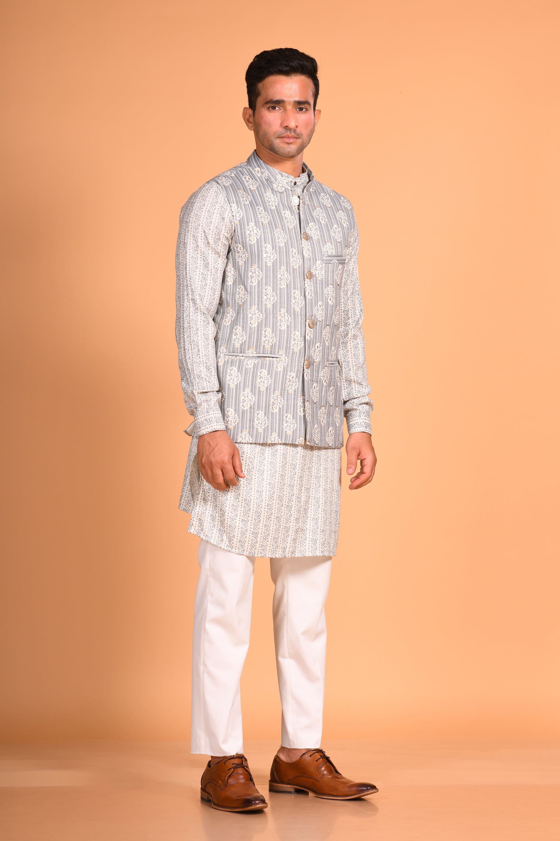 Elevate your ethnic wardrobe with this sophisticated grey kurta jacket set, designed for men who appreciate subtle elegance. The kurta features a refined all-over print in a matching grey tone, complemented by a mandarin collar and meenakari buttons for a touch of tradition. The full cuffed sleeves add a polished finish, making it perfect for festive or formal events. Paired with a sleek Nehru jacket in a tone-on-tone design with contrasting prints, this set exudes a contemporary charm. The jacket's cotton outer shell ensures breathability, while the luxurious satin lining offers superior comfort. The intricate meenakari buttons on the jacket bring the look together, making it a versatile yet standout piece for any occasion.