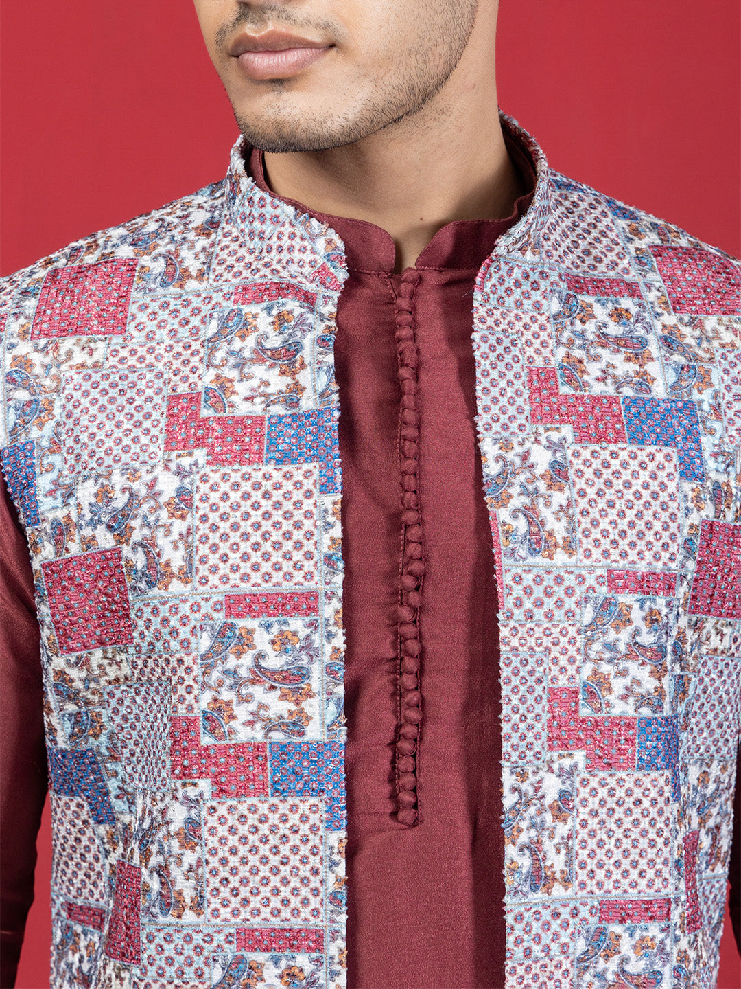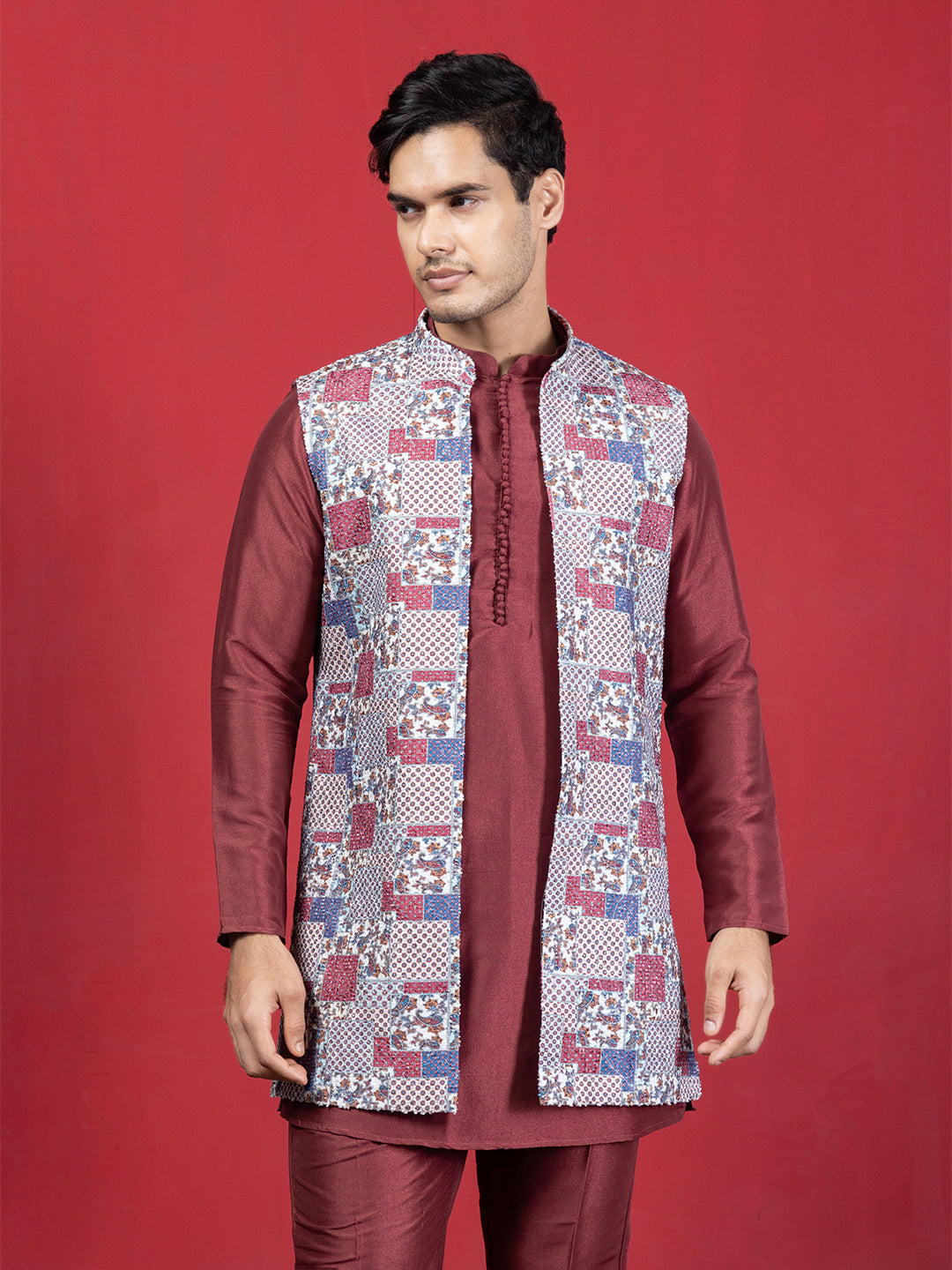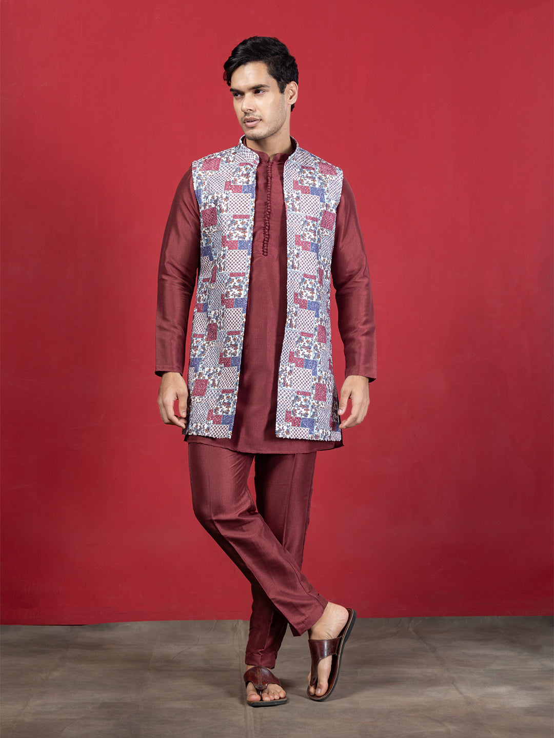Designed for those who prefer classic style with a touch of modern detailing, this maroon kurta set is an easy statement for any occasion. The kurta comes in a solid silk-blend fabric with a straight silhouette, mandarin collar, long sleeves, and a clean knee-length hem—simple, sharp, and effortlessly elegant.