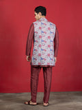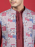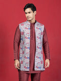 Maroon Silk-Blend Kurta Set with Knitted Printed Front-Open Jacket