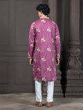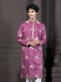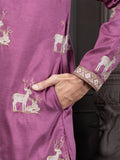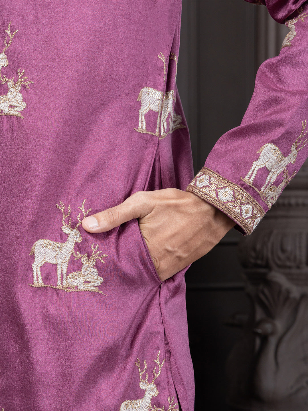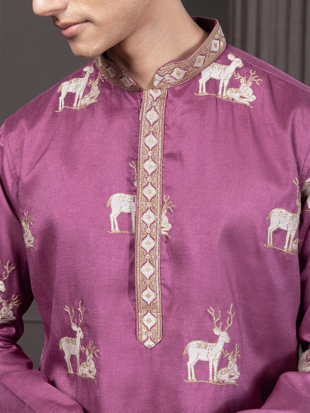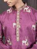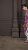 This mauve kurta is crafted from a smooth machine-woven blended cotton fabric, offering comfort with a refined finish. It features elegant ethnic motif detailing along with fine threadwork embroidery that adds subtle texture and artistry to the look. Designed with a classic mandarin collar, long regular sleeves, and a straight silhouette, it falls neatly to knee length with a clean straight hem.
