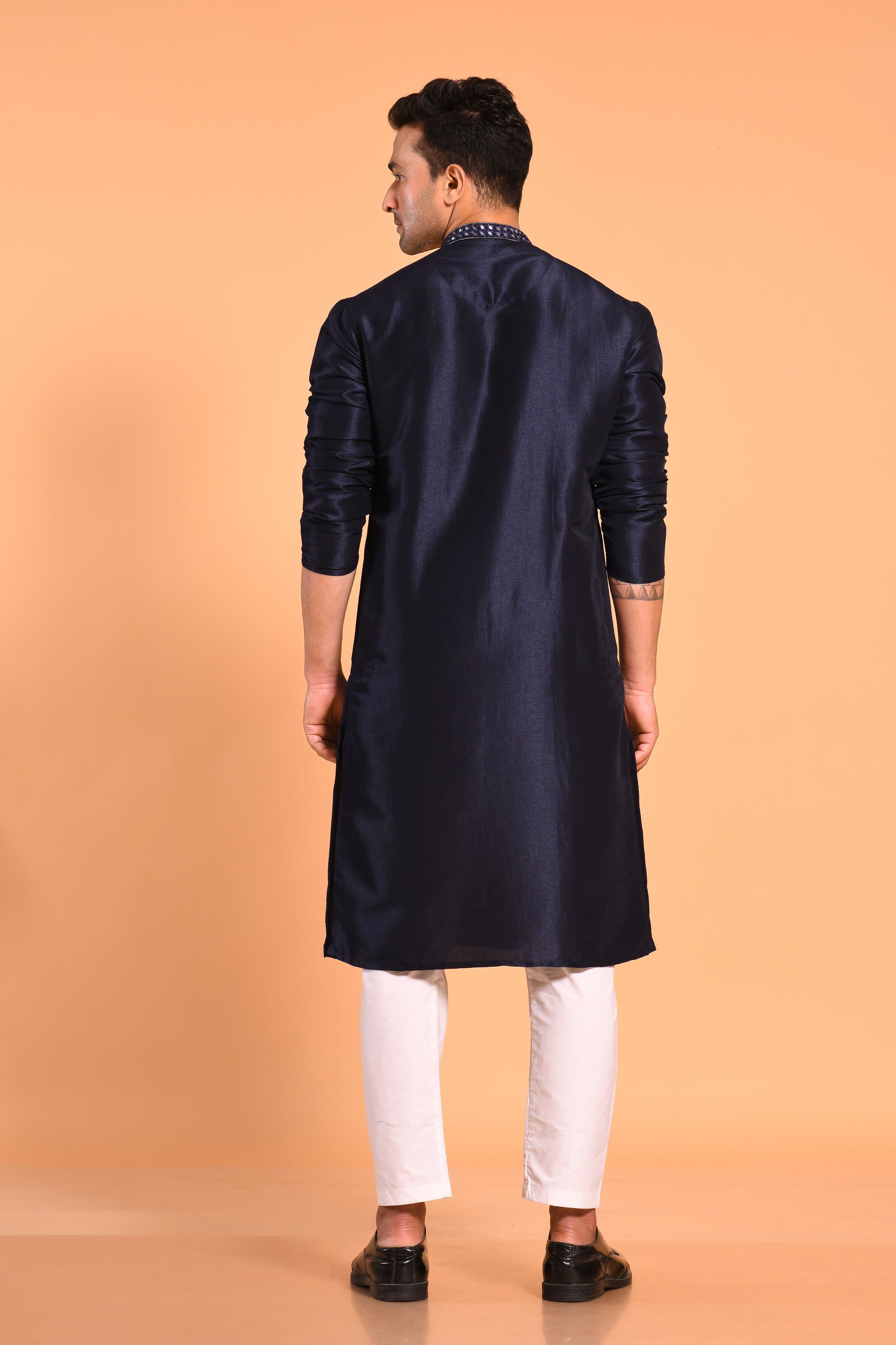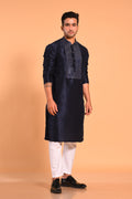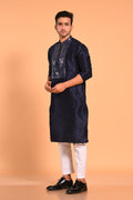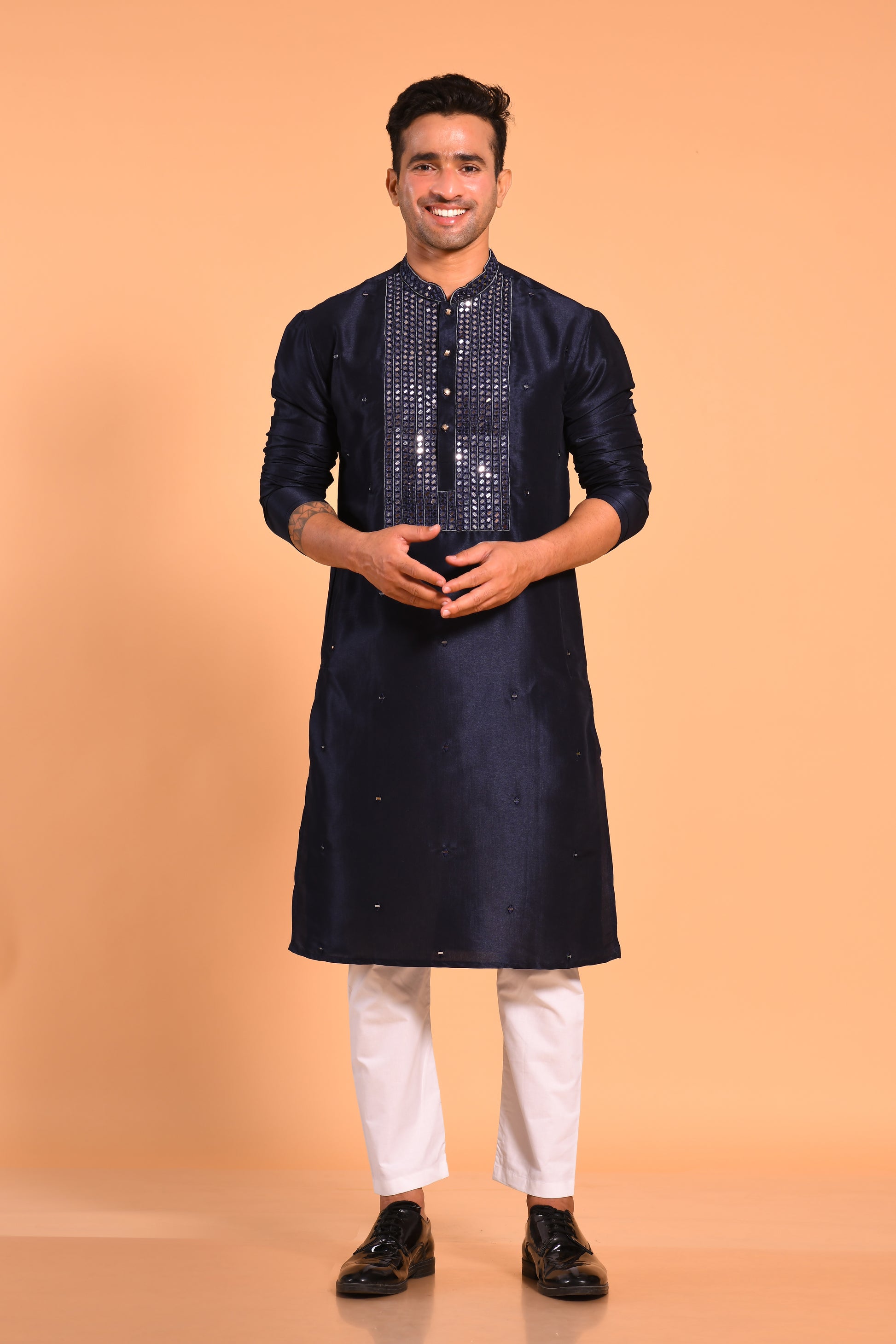 A sleek Navy Blue kurta crafted in soft art silk, featuring geometric embellishment with mirror-work detailing. Designed with a mandarin collar, long sleeves, and a straight knee-length silhouette, it offers a sharp, refined, and festive look—perfect for any special occasion.