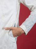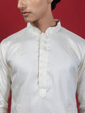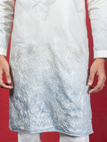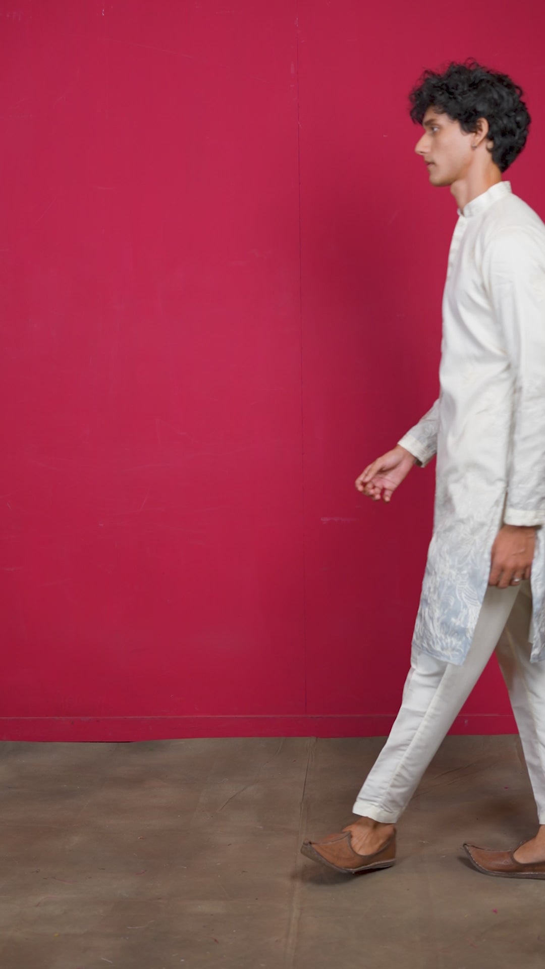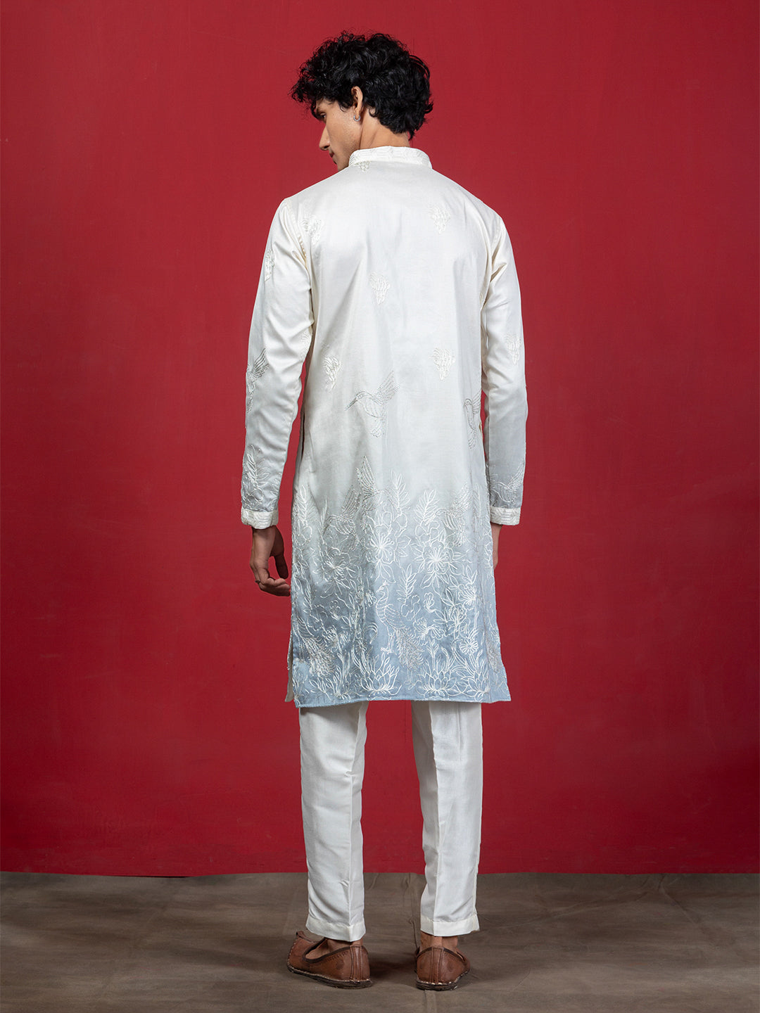 This off-white and grey Ombre kurta brings a refined blend of subtle shading and traditional artistry. Featuring ethnic motif embroidery done in delicate threadwork, it’s designed with a mandarin collar, long sleeves, and a straight, regular-fit silhouette that keeps the look classic and clean. Crafted from a viscose-blended silk machine-woven fabric, the kurta offers a smooth, premium feel and a knee-length straight hem—perfect for festive gatherings, cultural events, and elegant celebrations.