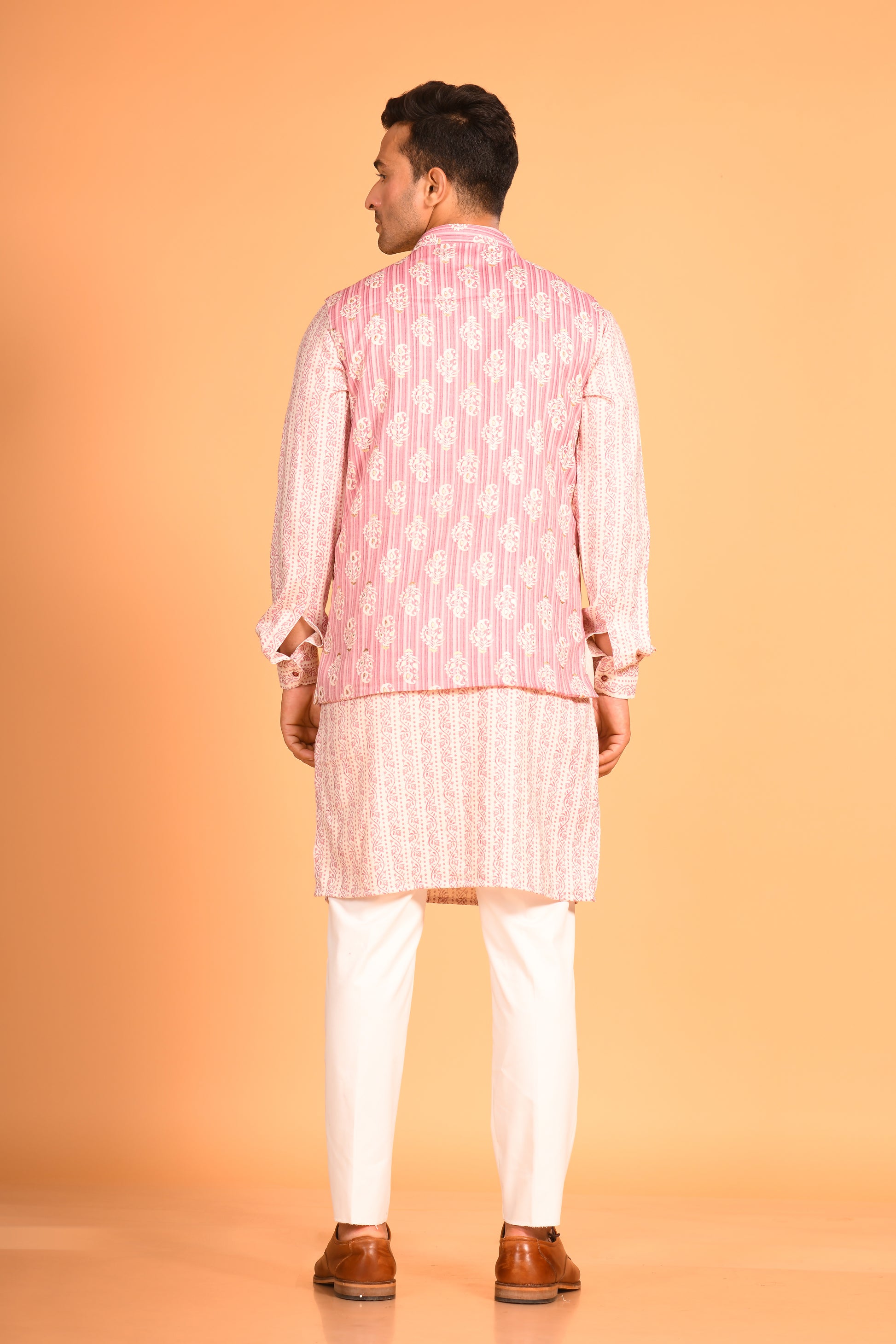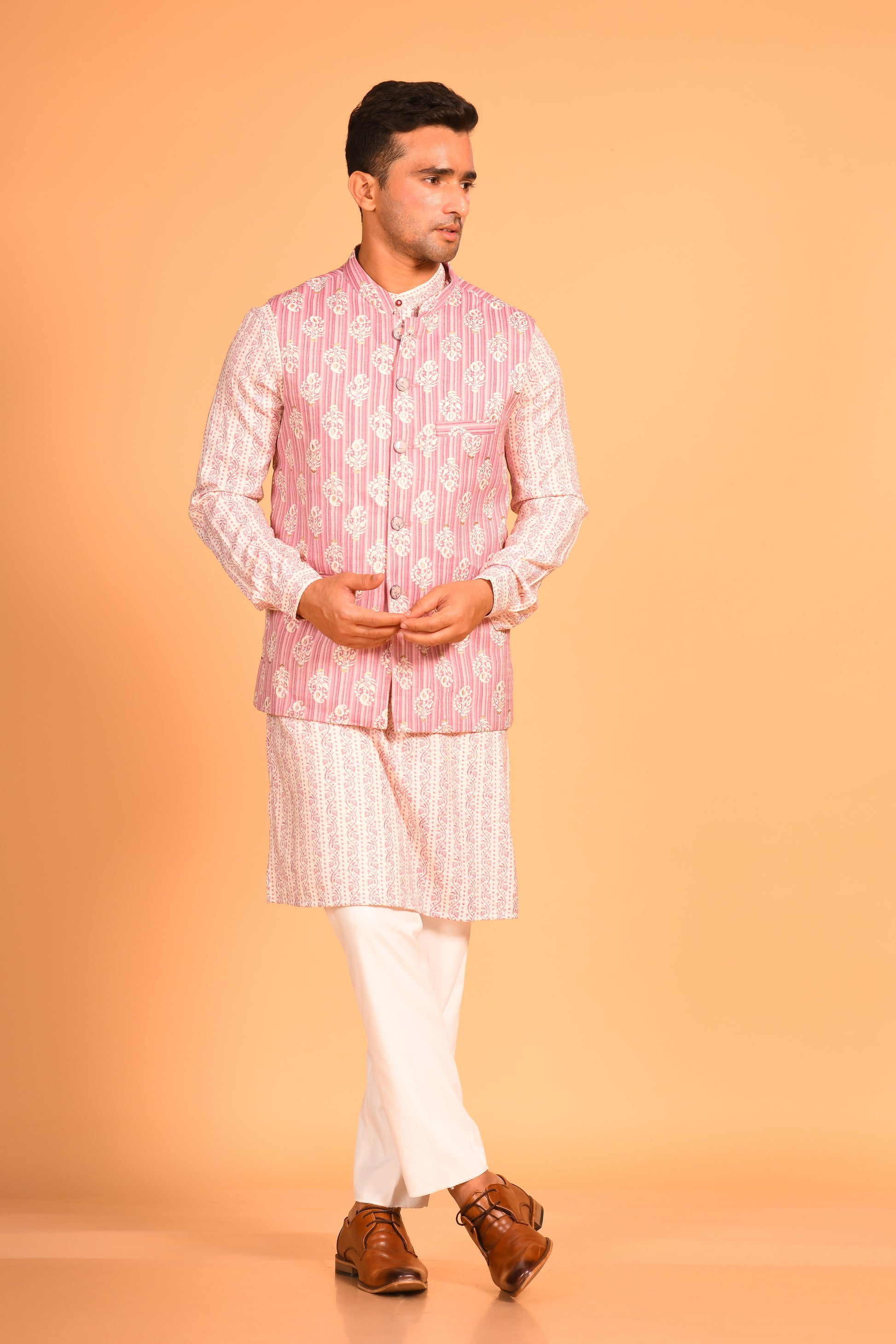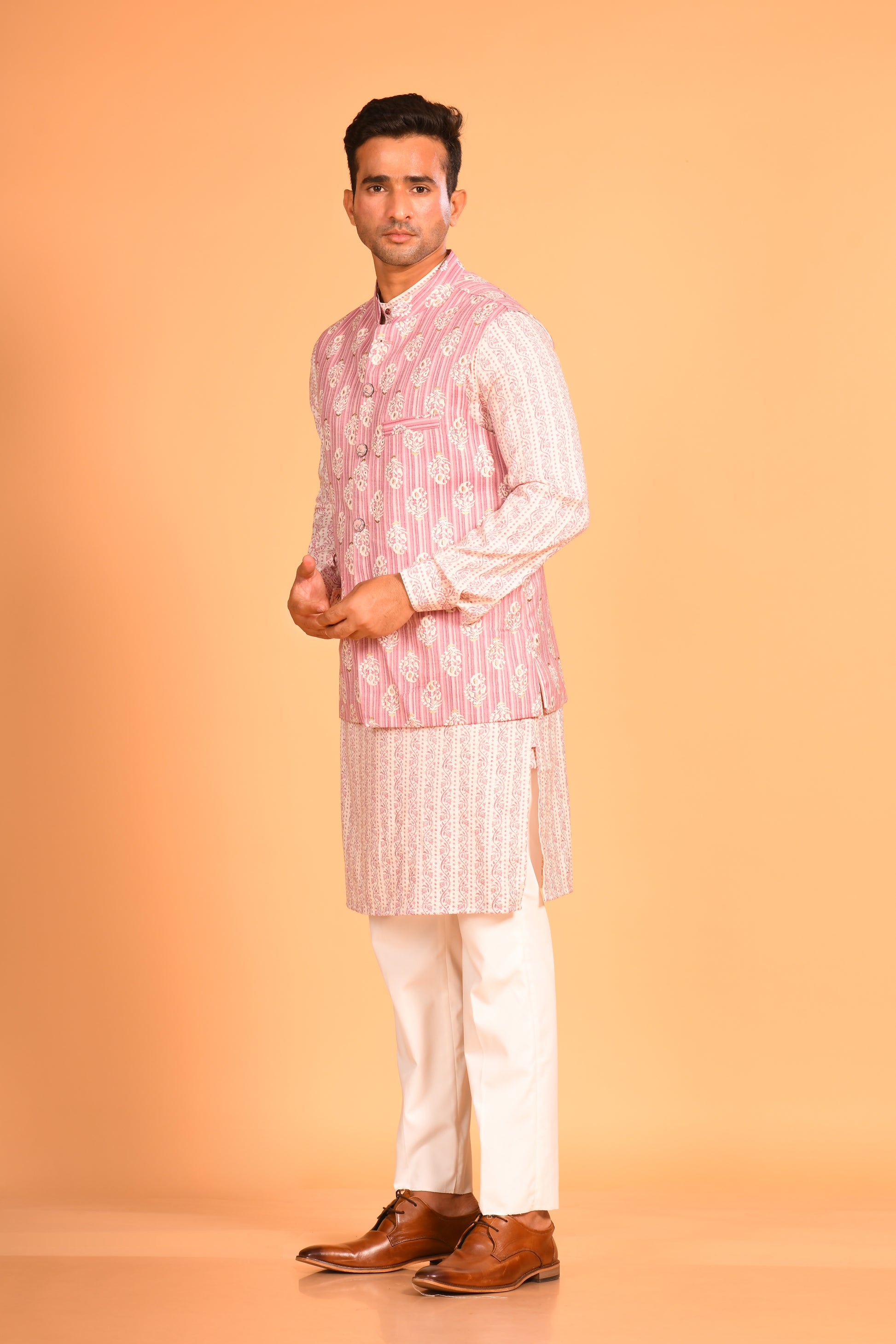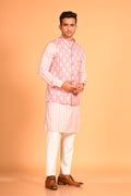 Elevate your ethnic wardrobe with this sophisticated Onion Pink kurta jacket set, designed for men who appreciate subtle elegance. The kurta features a refined all-over print in a matching light pink tone, complemented by a mandarin collar and meenakari buttons for a touch of tradition. The full cuffed sleeves add a polished finish, making it perfect for festive or formal events. Paired with a sleek Nehru jacket in a tone-on-tone design with contrasting prints, this set exudes a contemporary charm. The jacket's cotton outer shell ensures breathability, while the luxurious satin lining offers superior comfort. The intricate meenakari buttons on the jacket bring the look together, making it a versatile yet standout piece for any occasion.