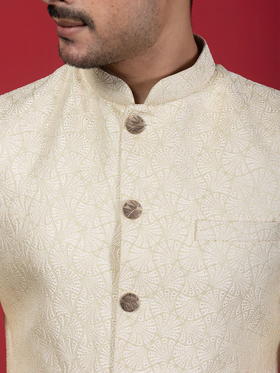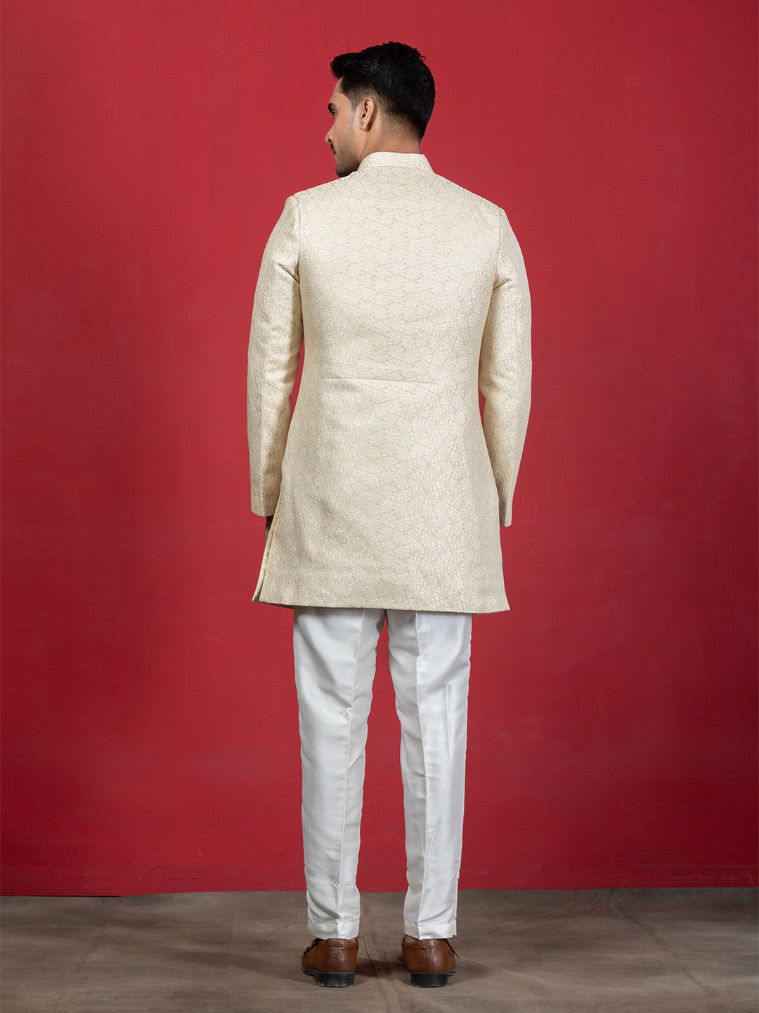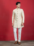 This pistachio green achkan sherwani features a rich woven jacquard design that gives it a regal and textured finish. It comes with a classic mandarin collar, a stylised front enhanced with elegant metal button closures, and long sleeves that complete the traditional silhouette.