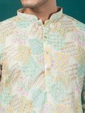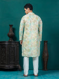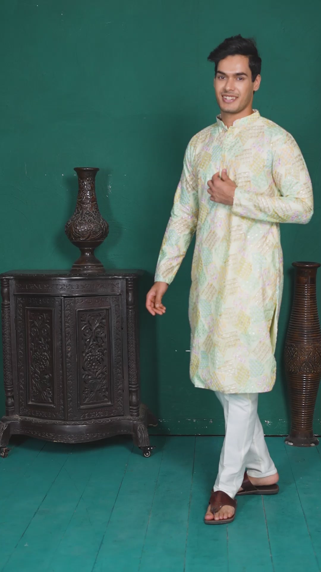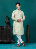 Step into festive elegance with this green art silk kurta, featuring position-printed ethnic motifs enhanced with intricate threadwork and sequin detailing. Designed with a mandarin collar, long sleeves, and a straight, regular-fit silhouette, it offers a clean and classic look. The knee-length cut and straight hem add to its timeless appeal, while the machine-woven art silk fabric gives it a smooth, refined finish—perfect for celebrations, gatherings, and traditional occasions.