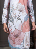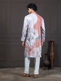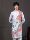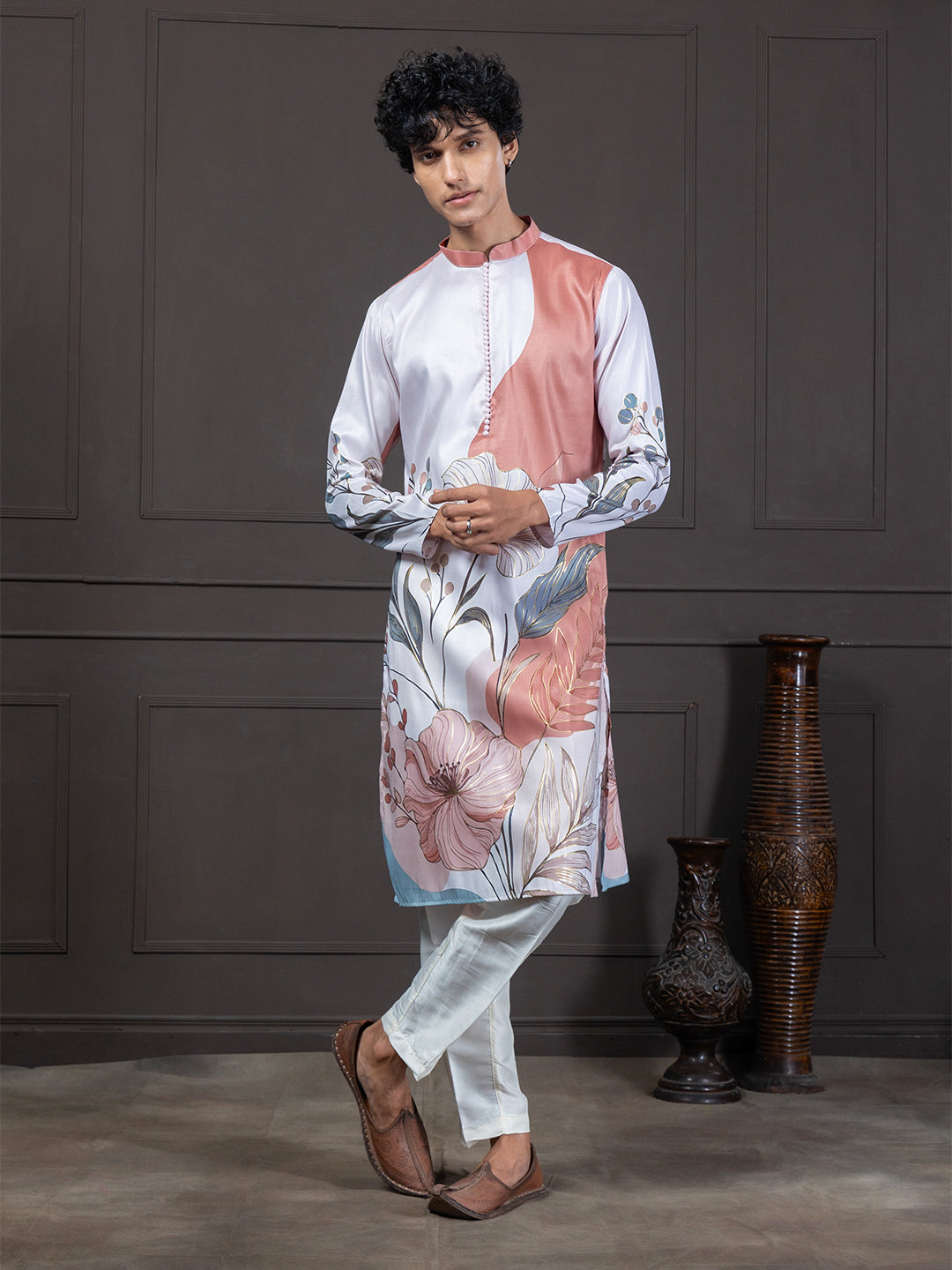 Crafted in a rich rust hue, this woven blended-silk kurta features an elegant floral design print that adds refined charm to your festive wardrobe. Designed with a mandarin collar, long sleeves, and a straight regular silhouette, it offers a clean knee-length finish for a polished look. Perfect for daytime functions, cultural events, and traditional celebrations.