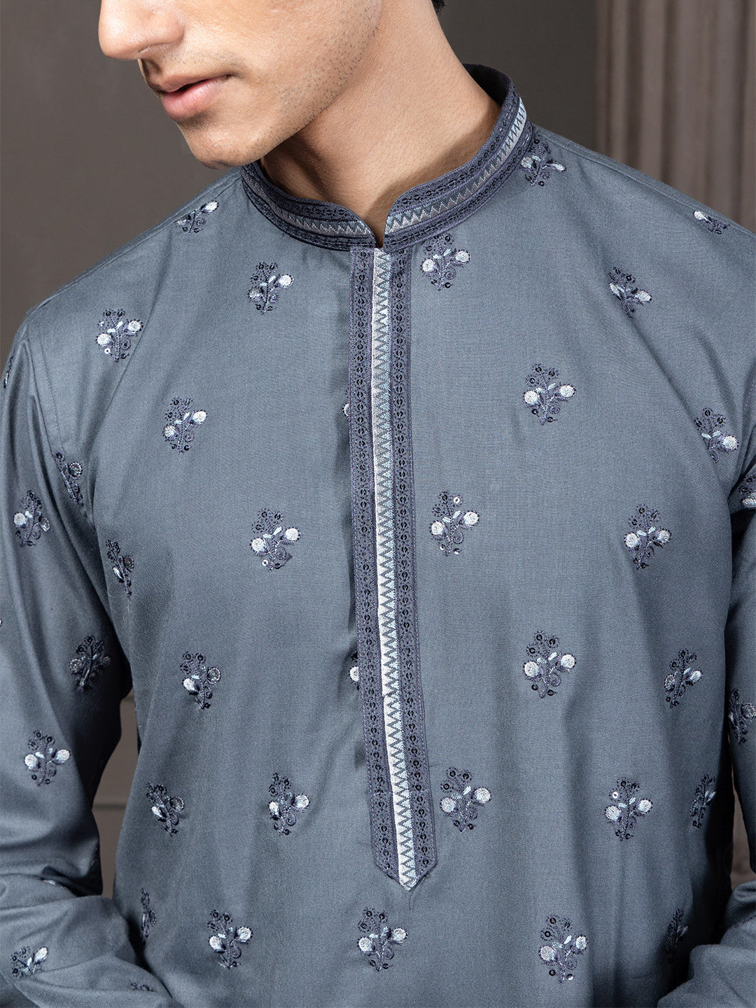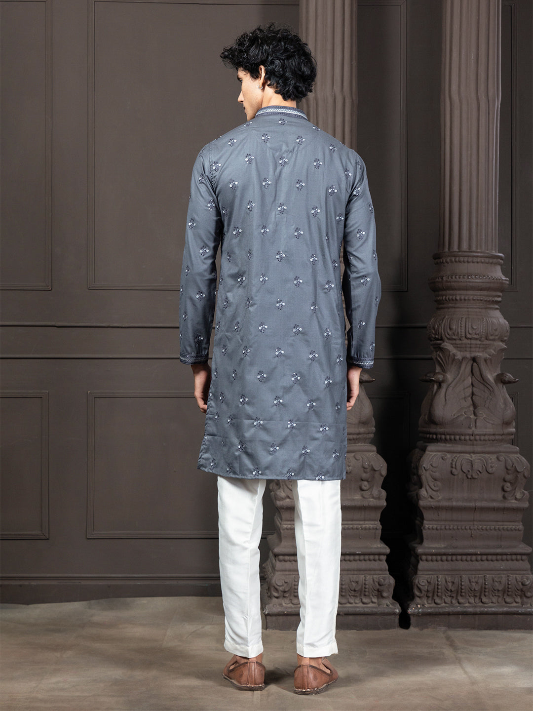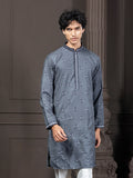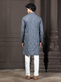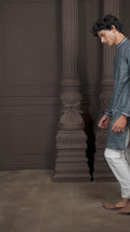 This slate blue kurta is crafted from blended cotton with a soft knitted cotton feel, offering both comfort and a clean drape. It features delicate buti-style motif embroidery, paired with a classic mandarin collar and long regular sleeves. The straight silhouette and knee-length straight hem keep the look simple, timeless, and effortlessly versatile.