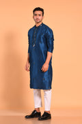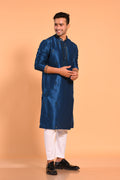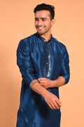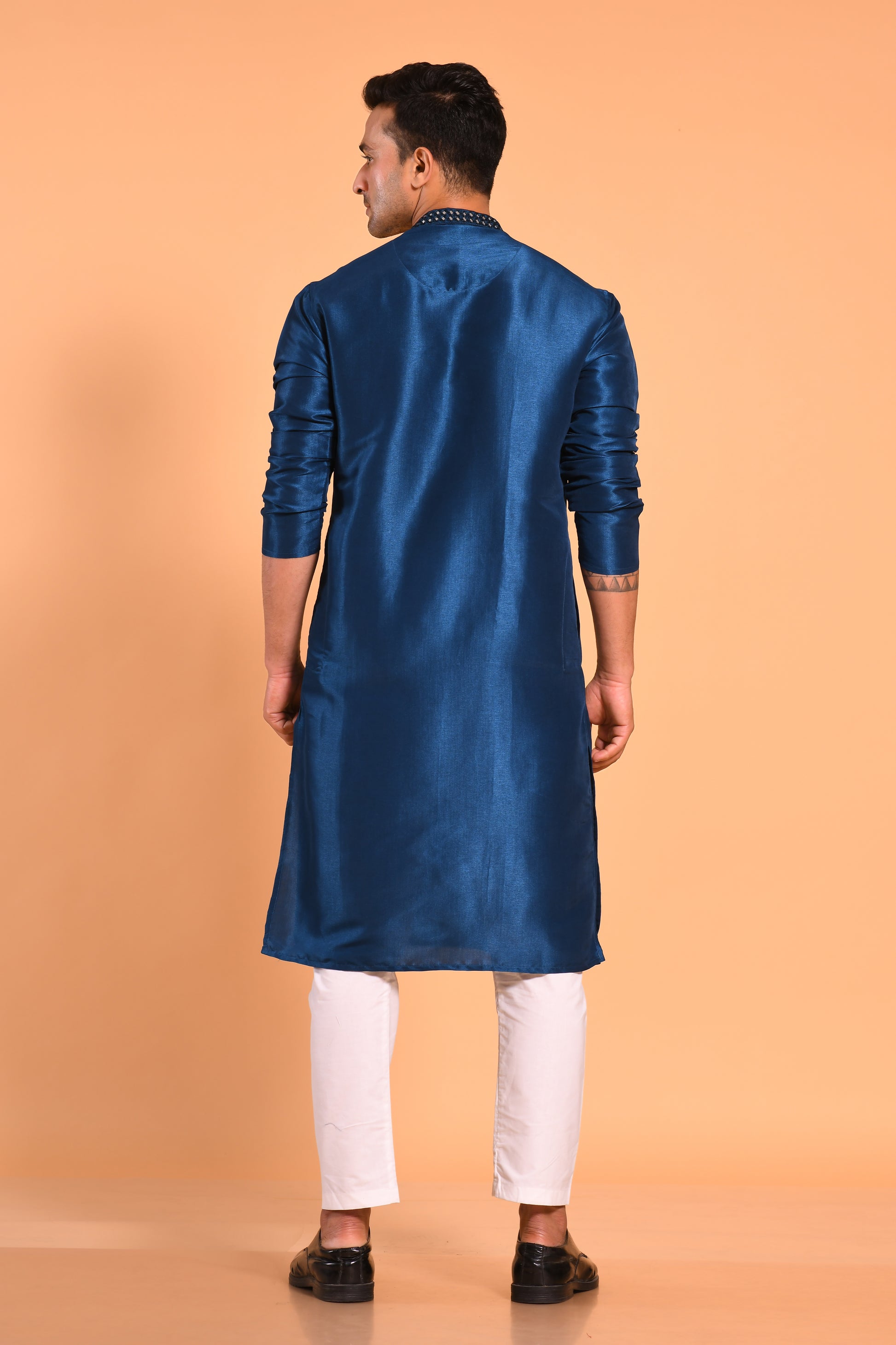 A striking teal blue kurta crafted in soft art silk, featuring geometric embellishment with real mirror work. Designed with a mandarin collar, long sleeves, and a straight knee-length silhouette, it offers a clean and classic festive look. Perfect to pair with pyjamas or tailored trousers.