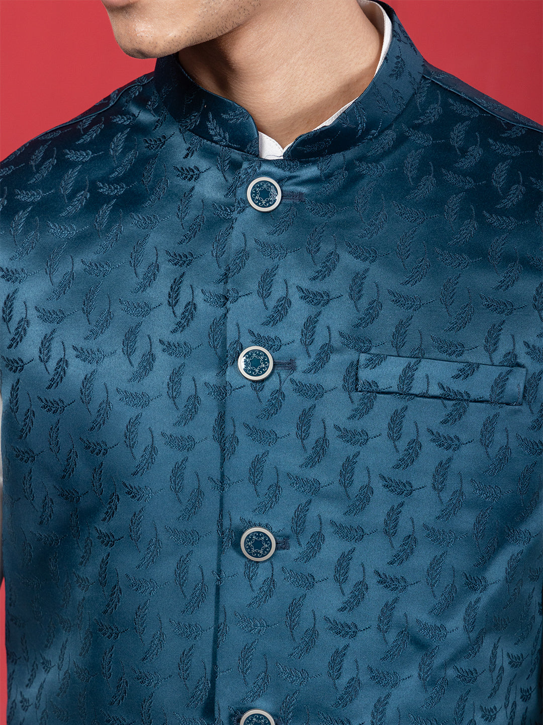 This teal blue Nehru jacket is crafted from rich woven jacquard fabric featuring elegant ethnic motifs that add depth and character to the design. It comes with a classic mandarin collar and a full button placket that enhances its traditional yet sharp appeal. The sleeveless construction ensures ease of layering, while the three functional pockets add both practicality and style.