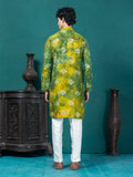 Add a burst of festive colour to your wardrobe with this Yellow–Orange Tie-Dye Embroidery Kurta. Made from a soft cotton-silk blend, it features motif prints highlighted with delicate thread and sequin embroidery for a subtle festive shine. The mandarin collar with concealed button closure keeps the look neat and structured, while the slim-fit silhouette, long sleeves, and straight knee-length cut offer a sharp, modern finish. Lightweight and smooth on the skin, this kurta is ideal for festive wear, family gatherings, and special occasions.