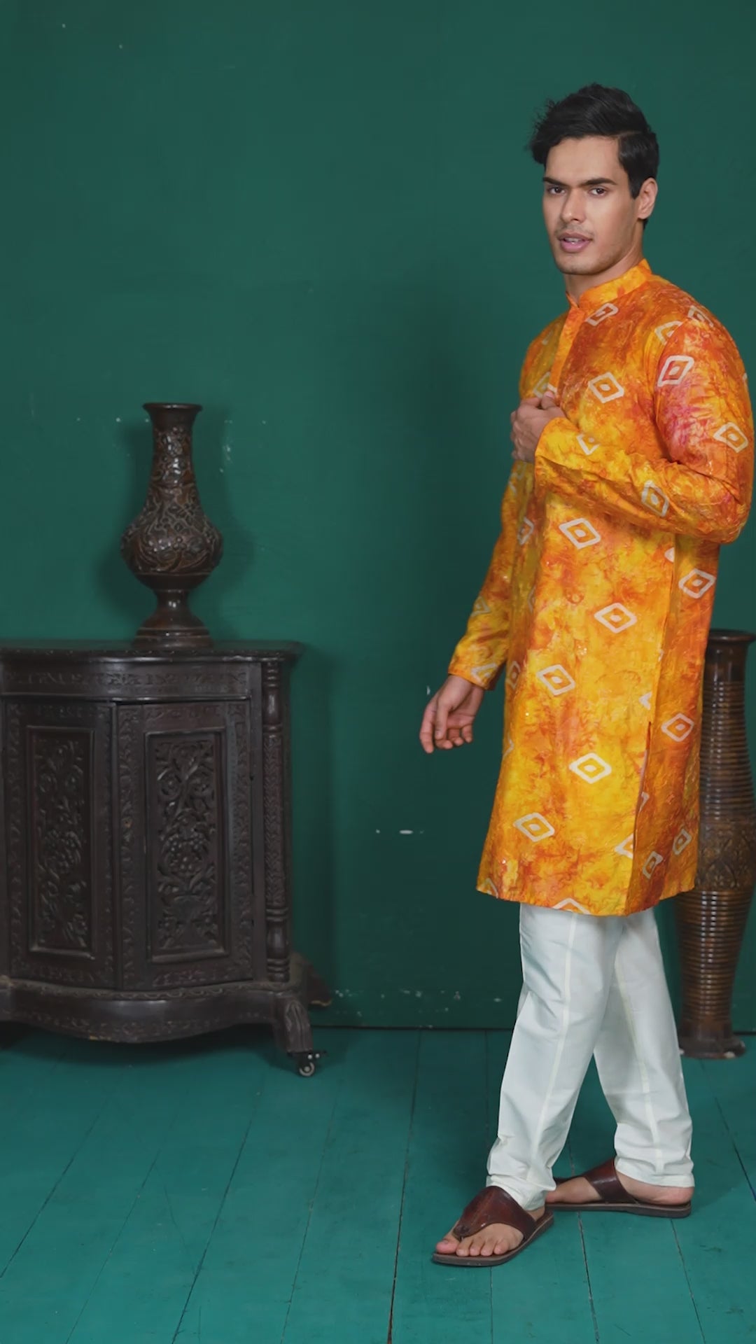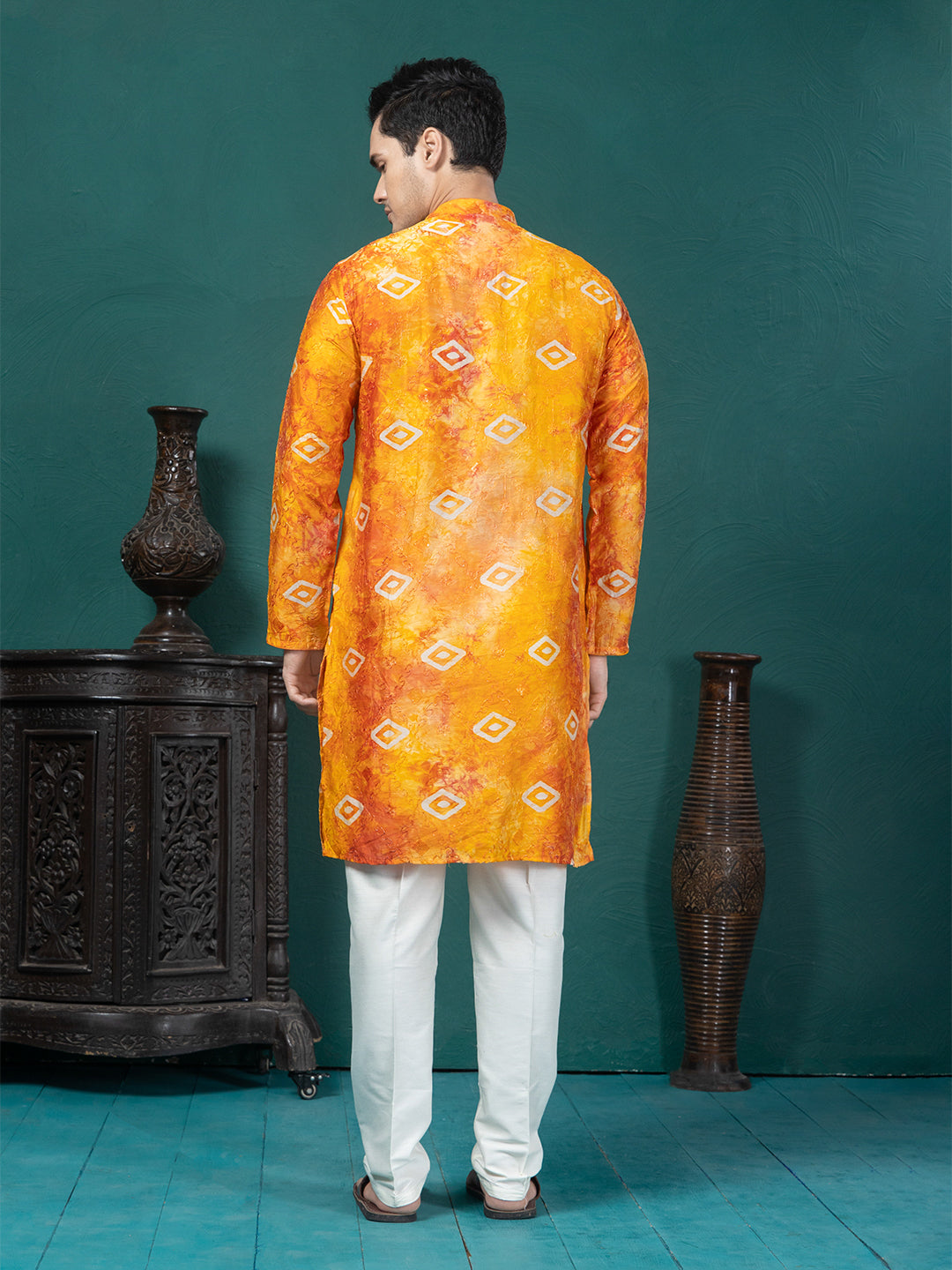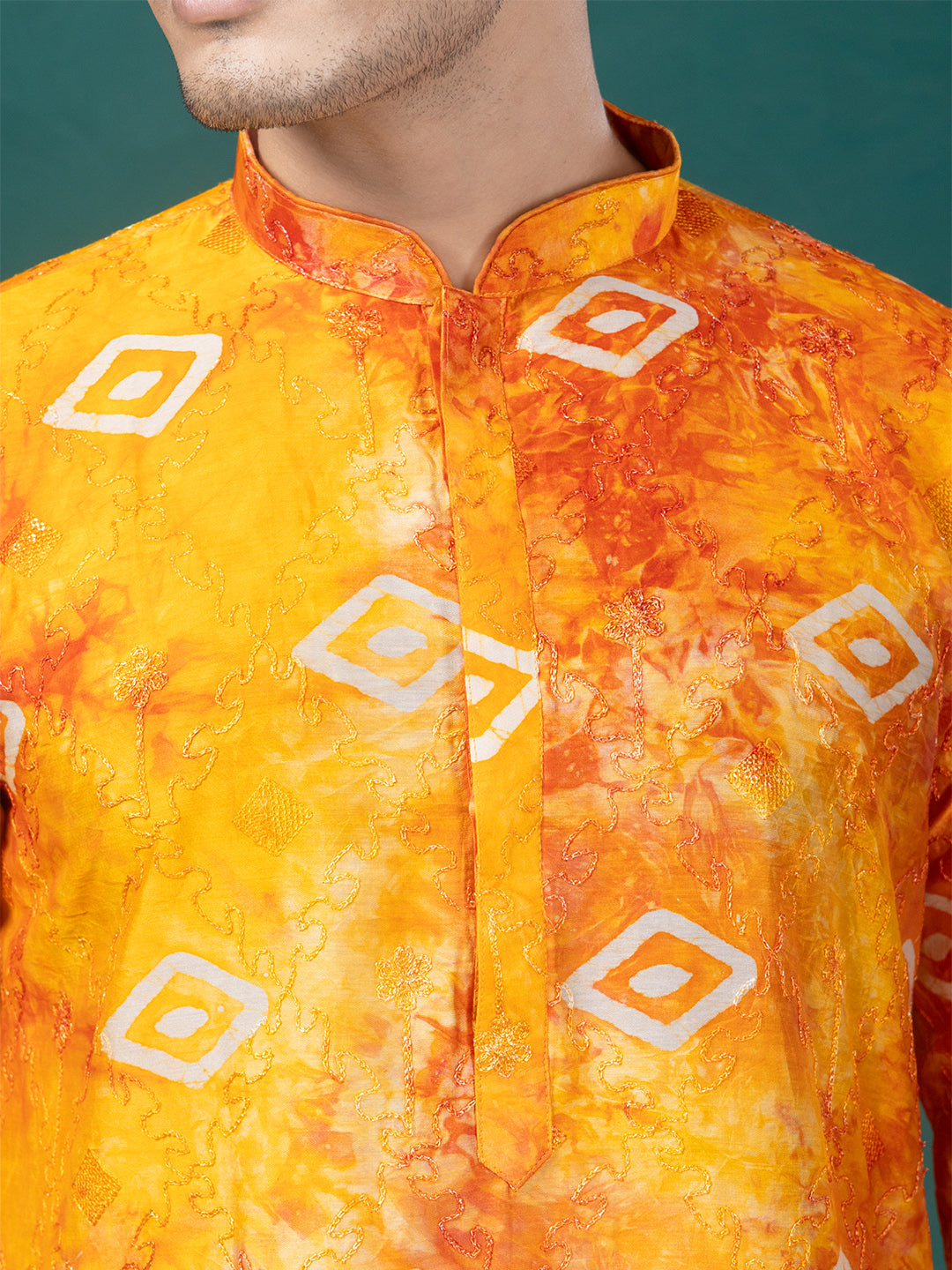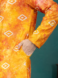 This kurta features a vibrant yellow and orange blend with a tie-dye effect enhanced by subtle motif prints. Crafted from soft, machine-woven cotton–silk, it offers a smooth feel and an elegant fall. The design includes a mandarin collar, long regular sleeves, and a straight-cut silhouette with a knee-length straight hem for a clean, classic look.