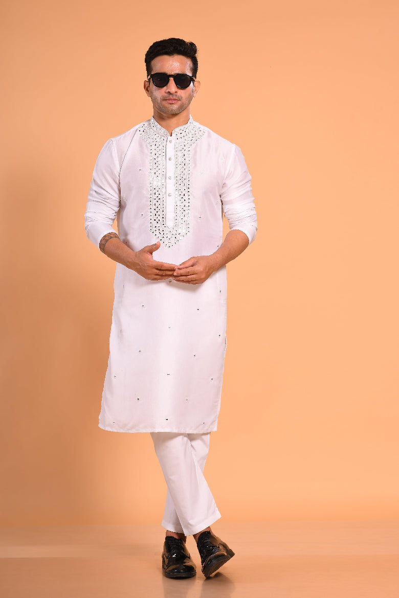 White Viscose Silk Real Mirror Work Kurta
