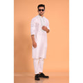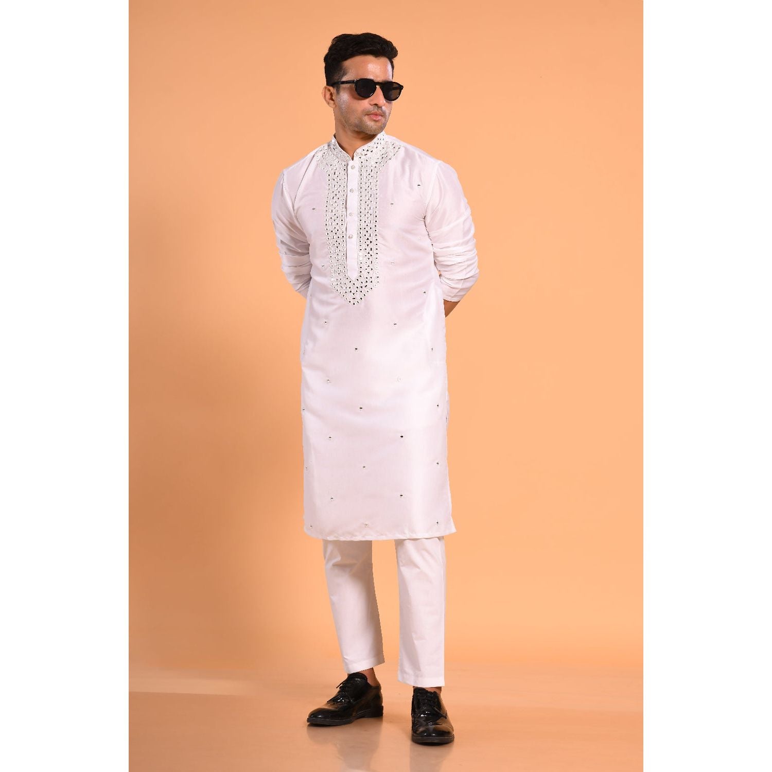 This White Viscose Silk Kurtas a perfect blend of elegance and traditional craftsmanship. Made from premium viscose silk, the fabric has a soft texture and a subtle sheen, giving it a soft to skin feel and beautiful drape. The highlight of this kurta is the intricate real mirror work detailing on the neck, yoke, and a touch of buta all over, adding a touch of sophistication and festive flair. Designed in a slim fit cut, this kurta fits close to the body while maintaining comfort and ease of movement. The length falls just above the knee, giving it a balanced, modern look. The fabric's natural fall enhances the overall appeal, making it perfect for pairing with churidar or straight pants.